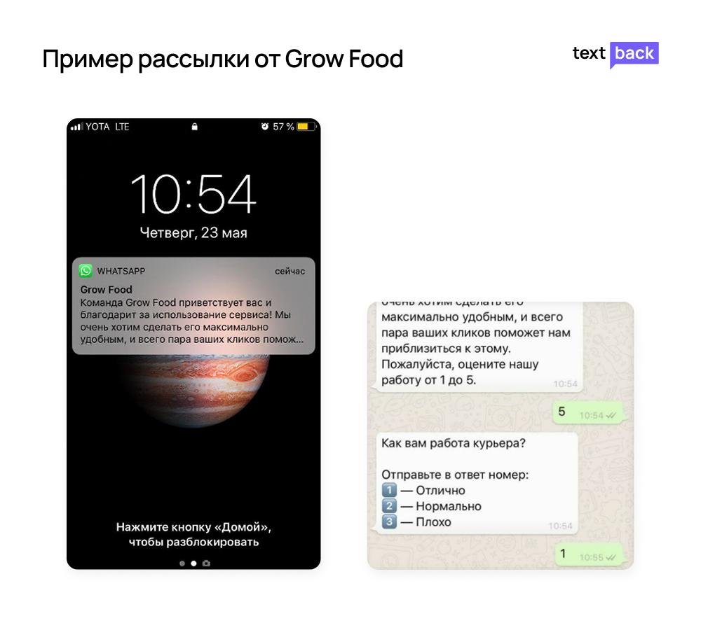 Grow Food — сервис доставки готового питания в Москве и Санкт-Петербурге. Раньше менеджер звонил клиенту через сутки после заказа, чтобы узнать, что понравилось, а что нет. Звонки позволяли опросить примерно 20% покупателей, а еще около 30% получали SMS с предложением дать оценку сервису.