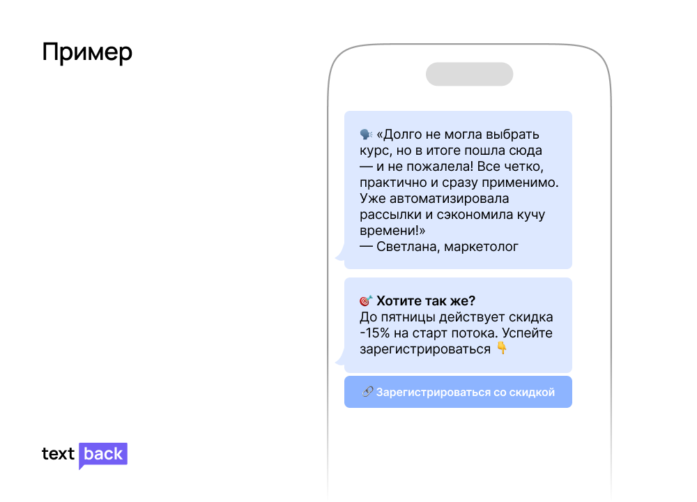 А главное — реакция в мессенджерах почти моментальная. Около 80% сообщений в WhatsApp читают в первые 5 минут, а общая открываемость превышает 90%. Это значит, что вы получаете быстрый контакт с пользователем, пока у него еще «горячий интерес» к продукту. Добавьте сюда социальное доказательство — и у вас не просто цепочка сообщений, а сценарий с максимальной конверсией.