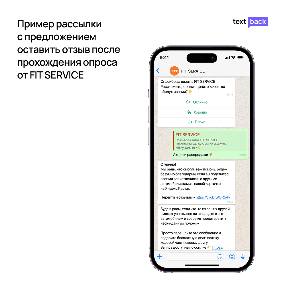 Мы в TextBack помогаем компаниям запускать такие механики под ключ: от сбора отзывов в WhatsApp и Telegram — до автопубликации, аналитики и использования в маркетинге. Напишите нам — разберем задачу, покажем примеры и предложим решение.