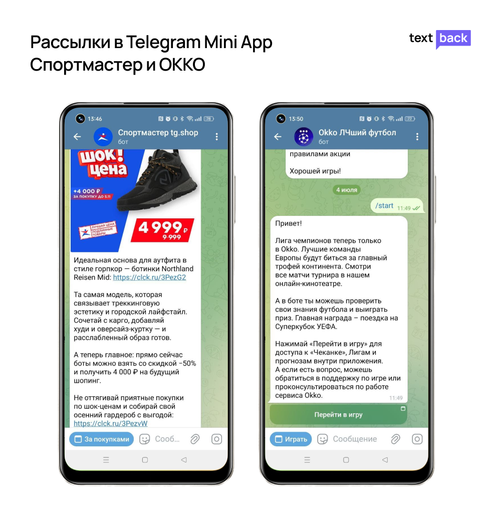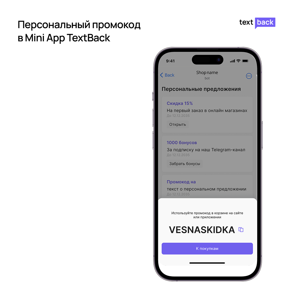 В Mini App TextBack клиент получает напоминания о бонусах, персональные промокоды, новости и рассылки прямо в мессенджере.