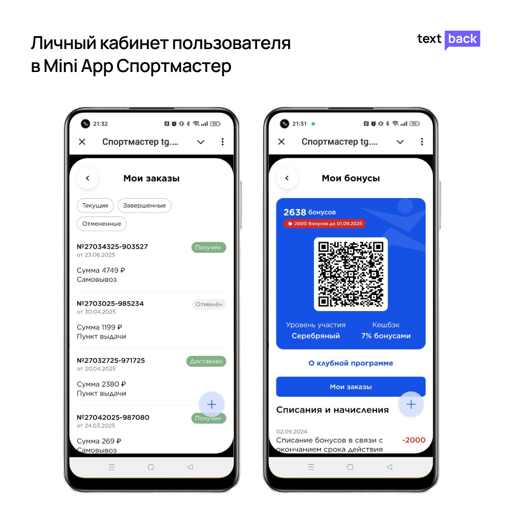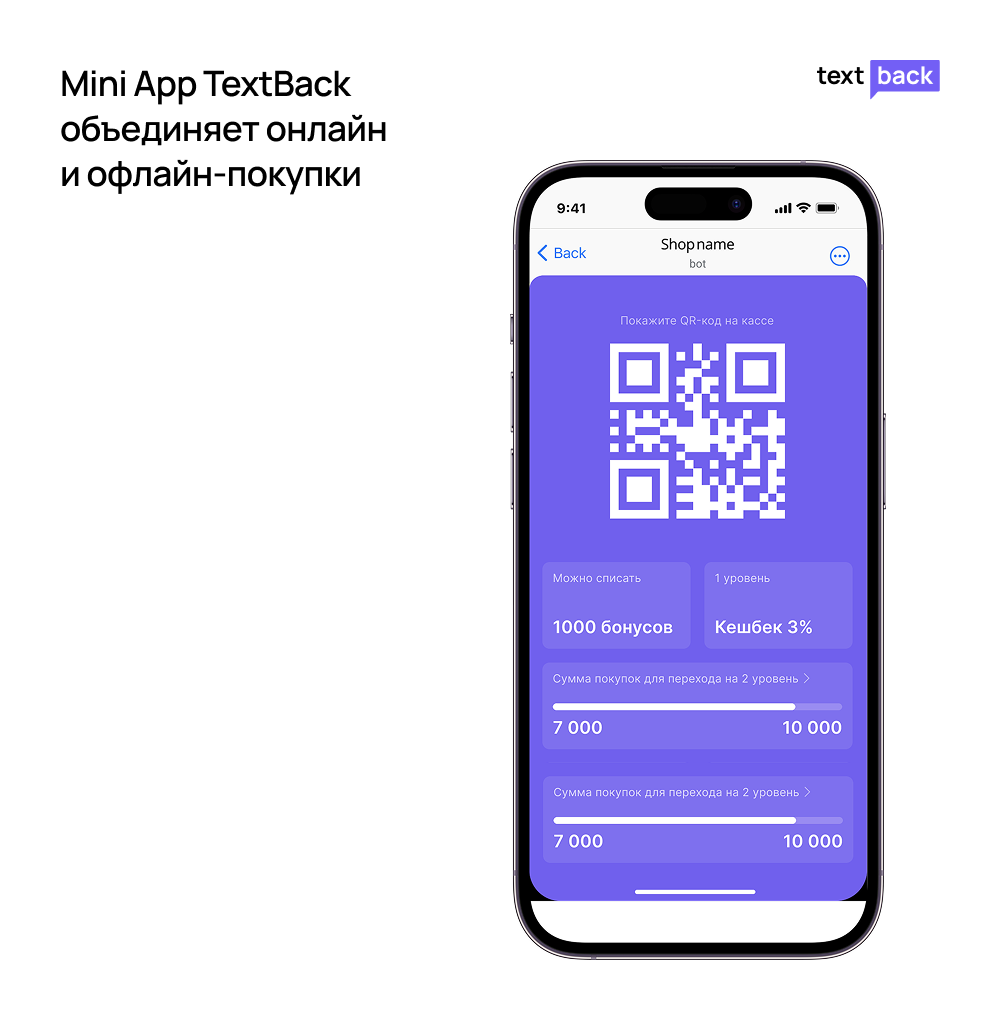 Mini App TextBack помогает объединить онлайн и офлайн в одном окне Telegram. Клиенту не нужно переключаться между сайтом, картой магазина и приложением: все заказы, бонусы, уровни программы и условия участия доступны в едином личном кабинете.