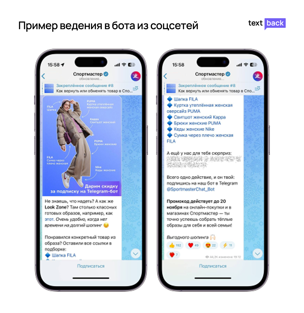 Подписчики уже следят за вашим контентом в официальных каналах — осталось перевести их в Telegram, чтобы работать напрямую. Сеть магазинов спортивных товаров Спортмастер переводит бесплатных подписчиков в бота из собственного Telegram-канала.