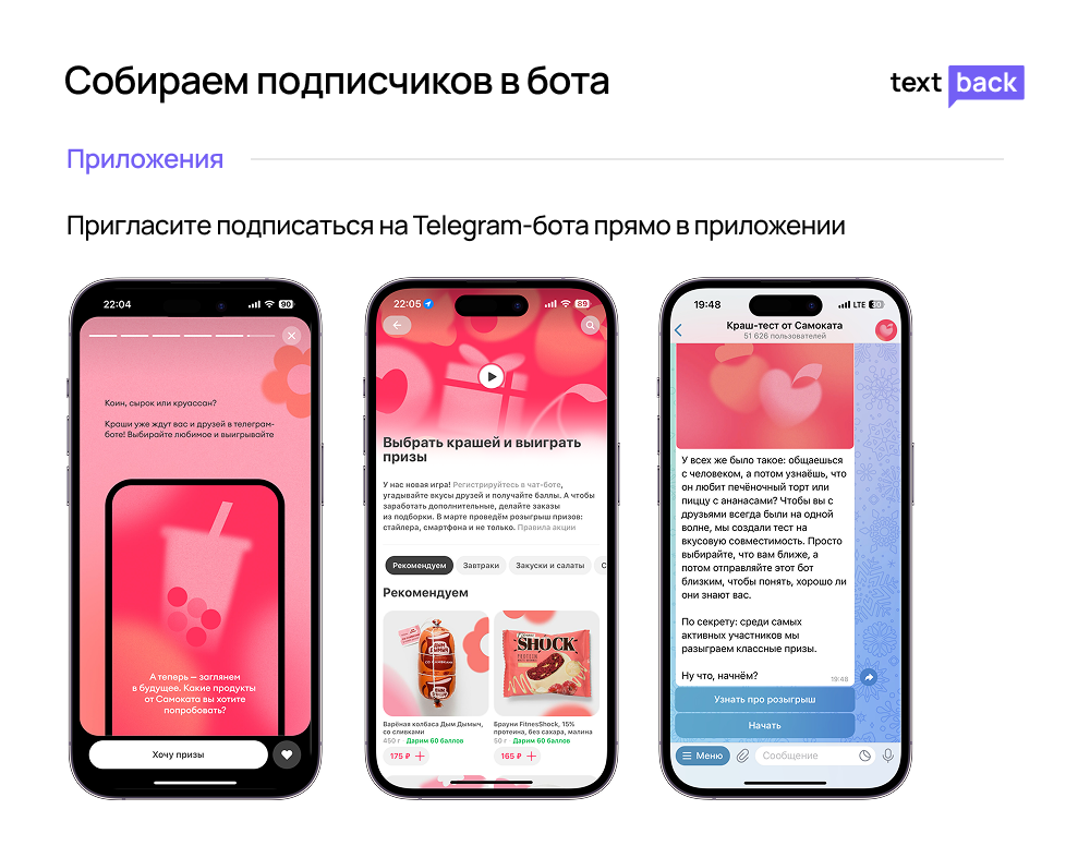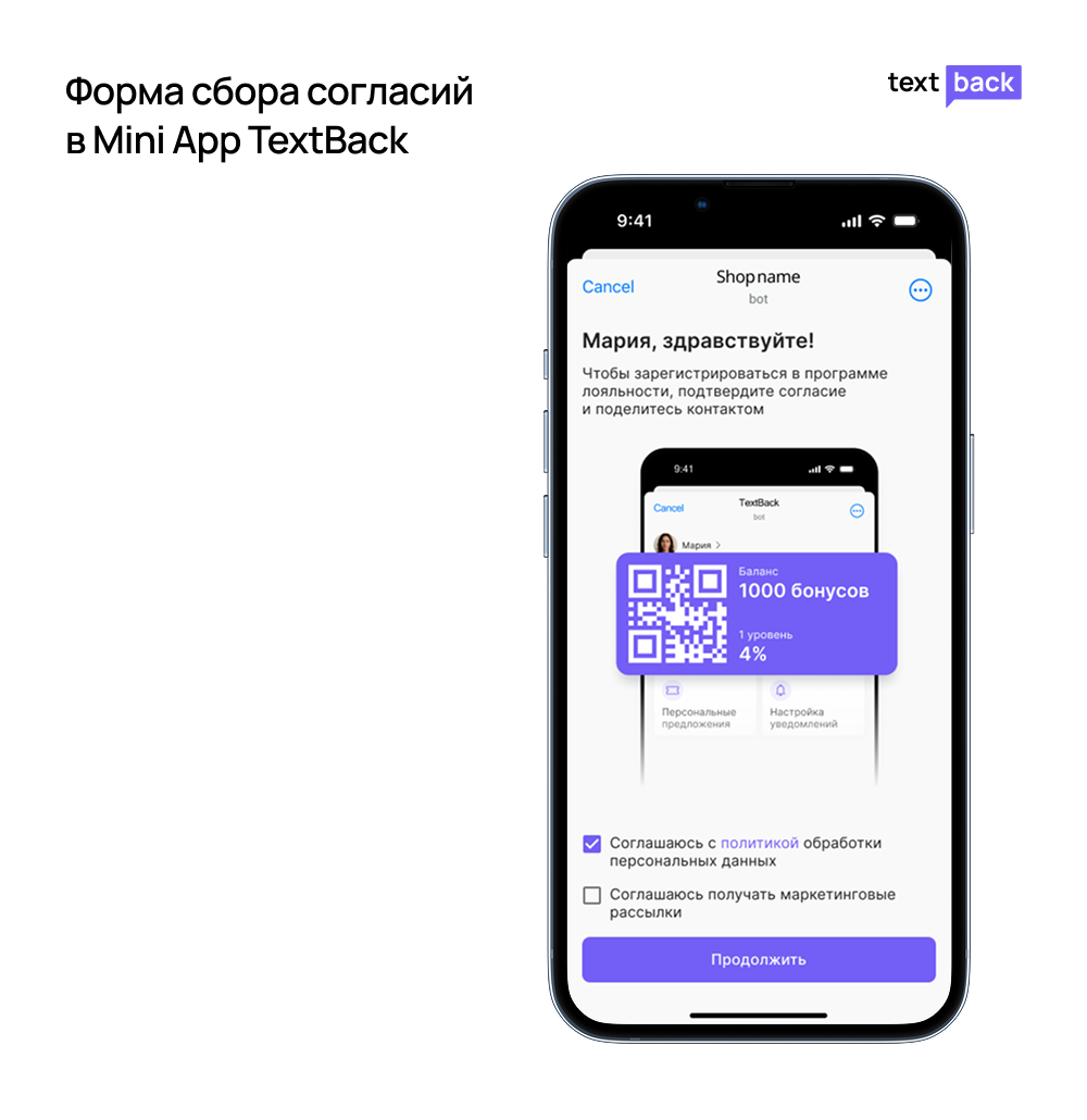У нас в TextBack есть аналогичный Mini App, который позволяет объединять программу лояльности с ботом и собирать контакты клиентов автоматически.
