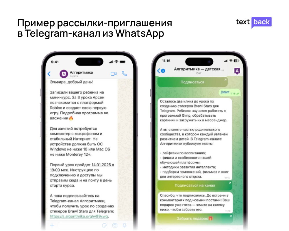 Онлайн-школа программирования и цифровых навыков для детей Алгоритмика в WhatsApp-рассылке предлагает подписаться на Telegram-канал. При этом ссылка из сообщения ведет в чат-бот, который проверяет подписку.