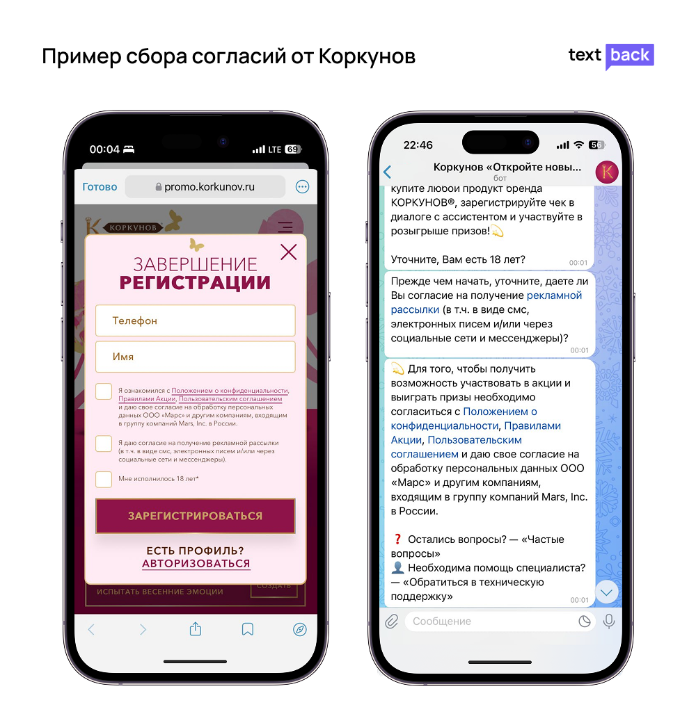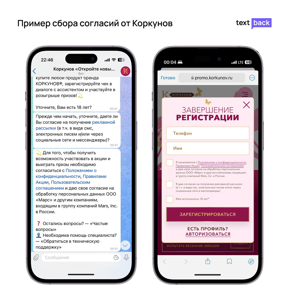 Компания Коркунов размещает QR-коды на продукции и берет согласия на рассылки и участие в акции через сайт. Для этого используется Double Opt-In, механизм двойного подтверждения через чекбоксы.