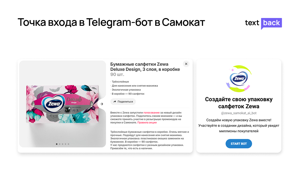 Сервис доставки Самокат мотивирует перейти в бот, участвовать в разработке нового дизайна упаковки и получить промокод на покупки. Переход настроен из карточки товара.