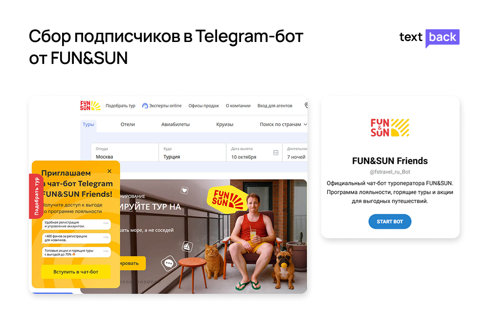 Туроператор FUN&SUN привлекает подписчиков акциями и бонусами программы лояльности. Ведет в Telegram-бот через виджет на сайте.