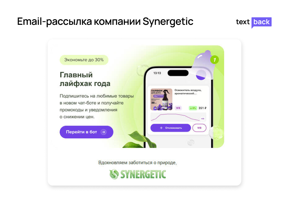 Бренд эко-средств для дома и семьи Synergetic мотивирует переходить в Telegram-бот, чтобы узнавать о промокодах и снижении цен.