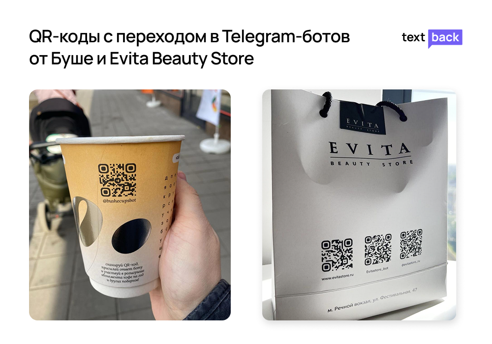 Сеть кондитерских Буше предлагает поиграть и отгадать загадку в Telegram-боте. А магазин премиум-косметики Evita Beauty Store размещает QR-коды для подписчиков на фирменных пакетах.