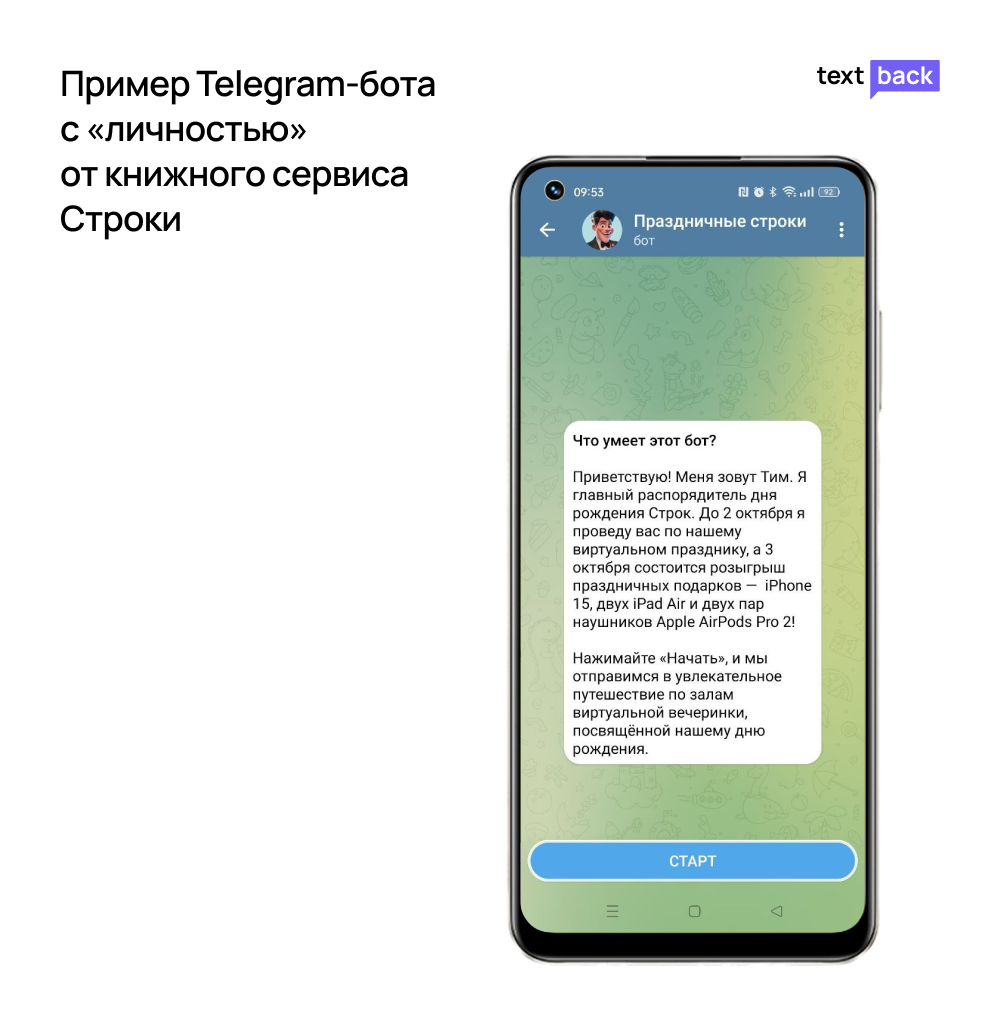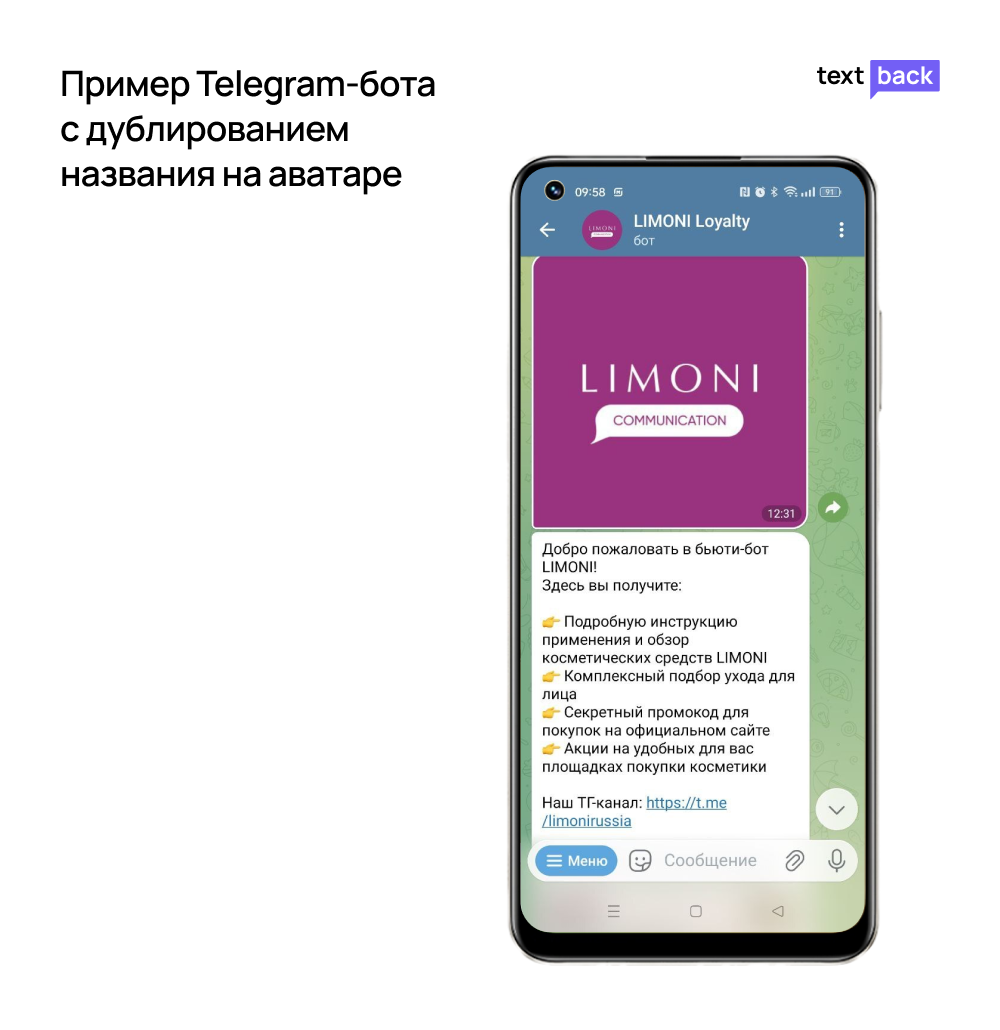 - помогает подчеркнуть характер бренда — пользователь сразу понимает, что это ваш бот, а не чья-то копия;