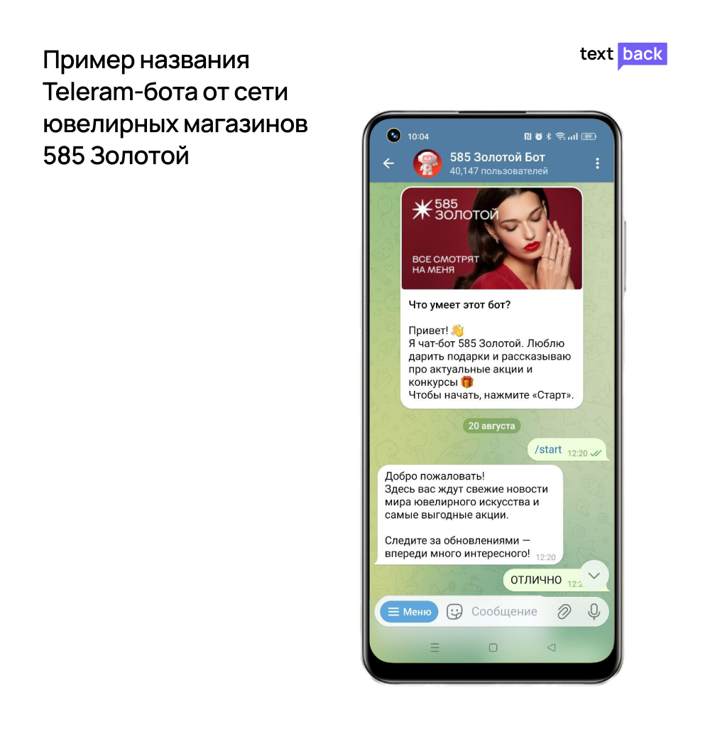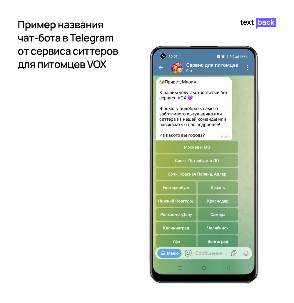 Исследования в области UX показывают: чем короче и понятнее текст, тем выше вероятность, что пользователь на него откликнется. Поэтому короткое и выразительное имя бота сразу «цепляет» взгляд. Оно также помогает при поиске диалога и экономит время пользователя.