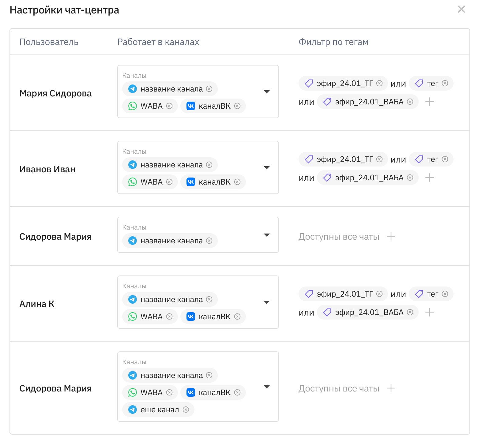 Так администратор гибко управляет тем, какие чаты и из каких каналов будут доступны каждому сотруднику.