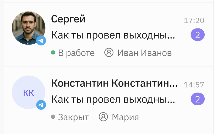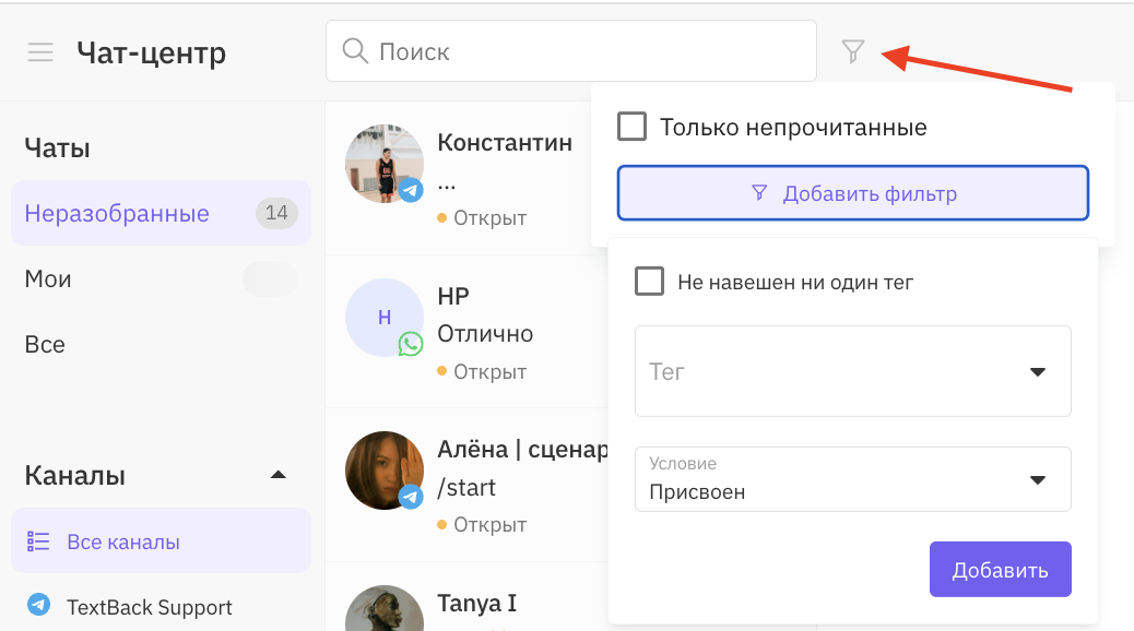 - Можно фильтровать чаты по каналам, тегам и статусам.