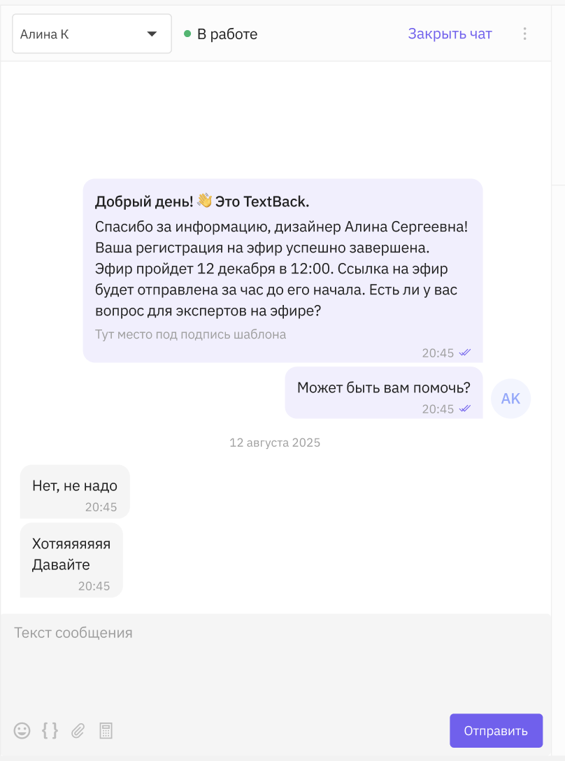 - Если ответа не требуется, просматривает диалог и закрывает его кнопкой «Закрыть чат» в верхней панели.