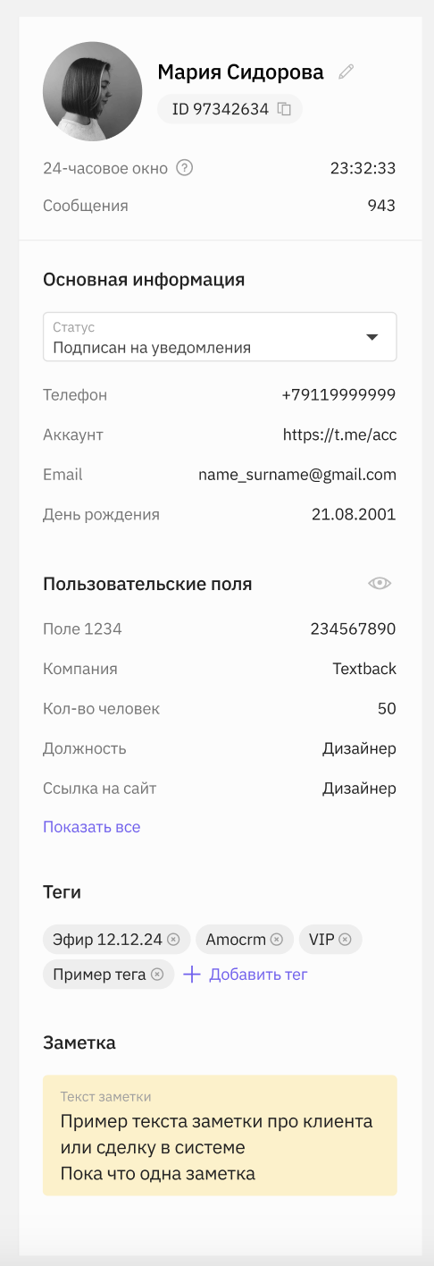 - Профиль контакта: данные клиента, его имя, телефон, email, теги, заметки.