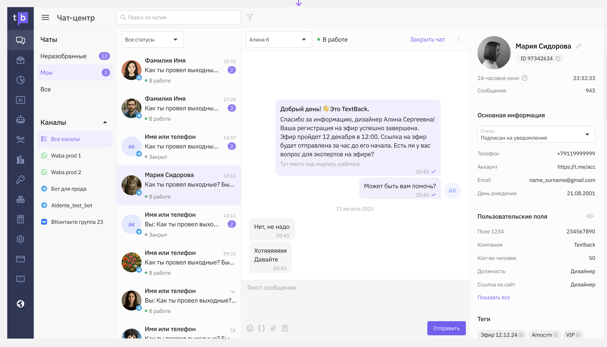 Чат-центр — это единое окно для общения с клиентами. Здесь ваши операторы видят все входящие сообщения из разных каналов (WhatsApp, VK, Telegram) и могут быстро отвечать.