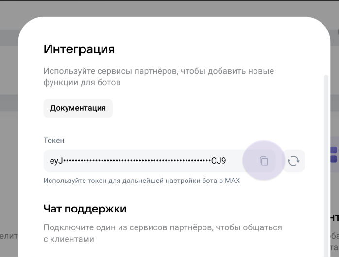 - Сразу после модерации становится доступен токен бота в разделе «Интеграция». Он нужен для подключения конструкторов, CRM и других сервисов, например, TextBack.