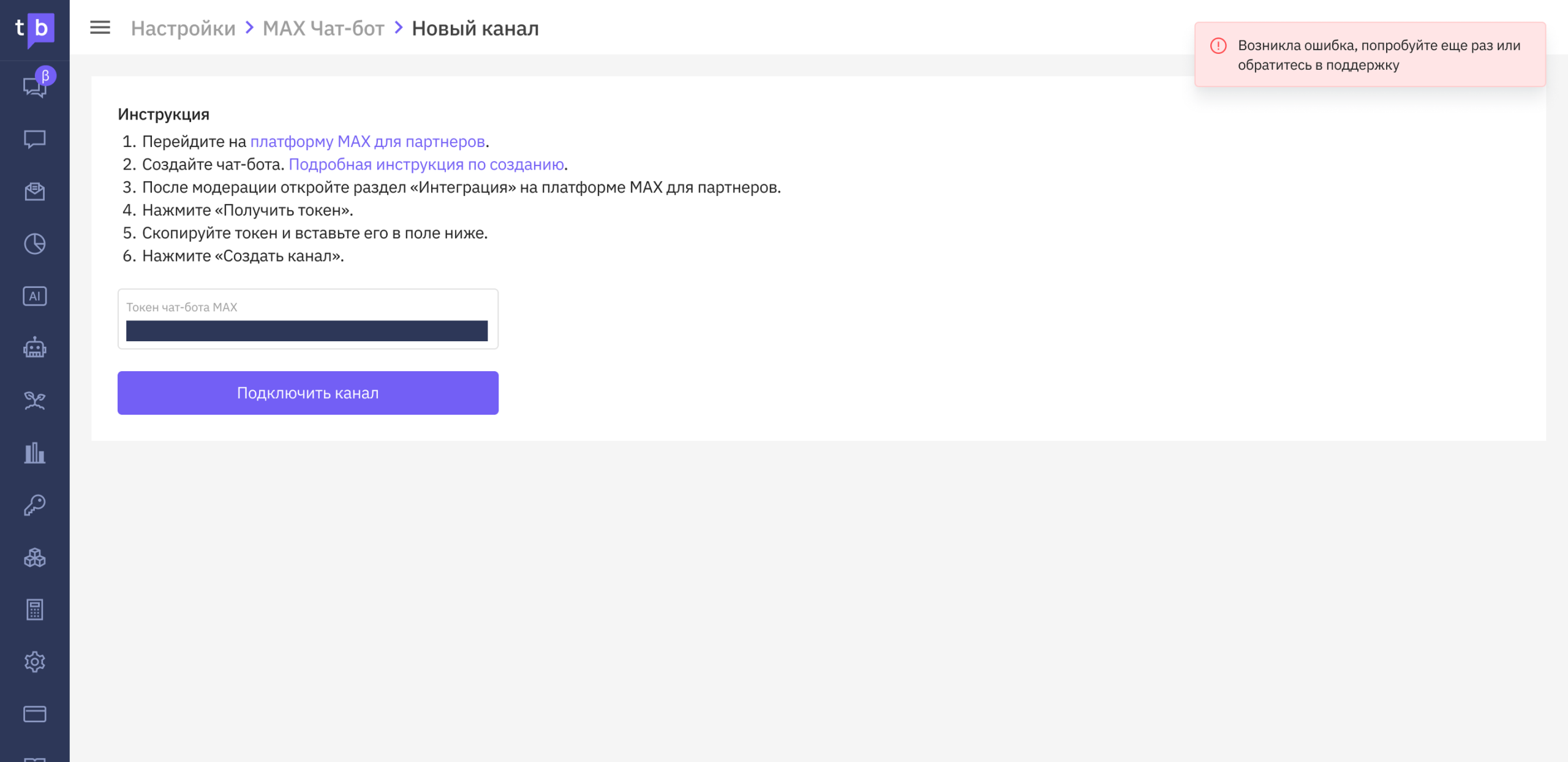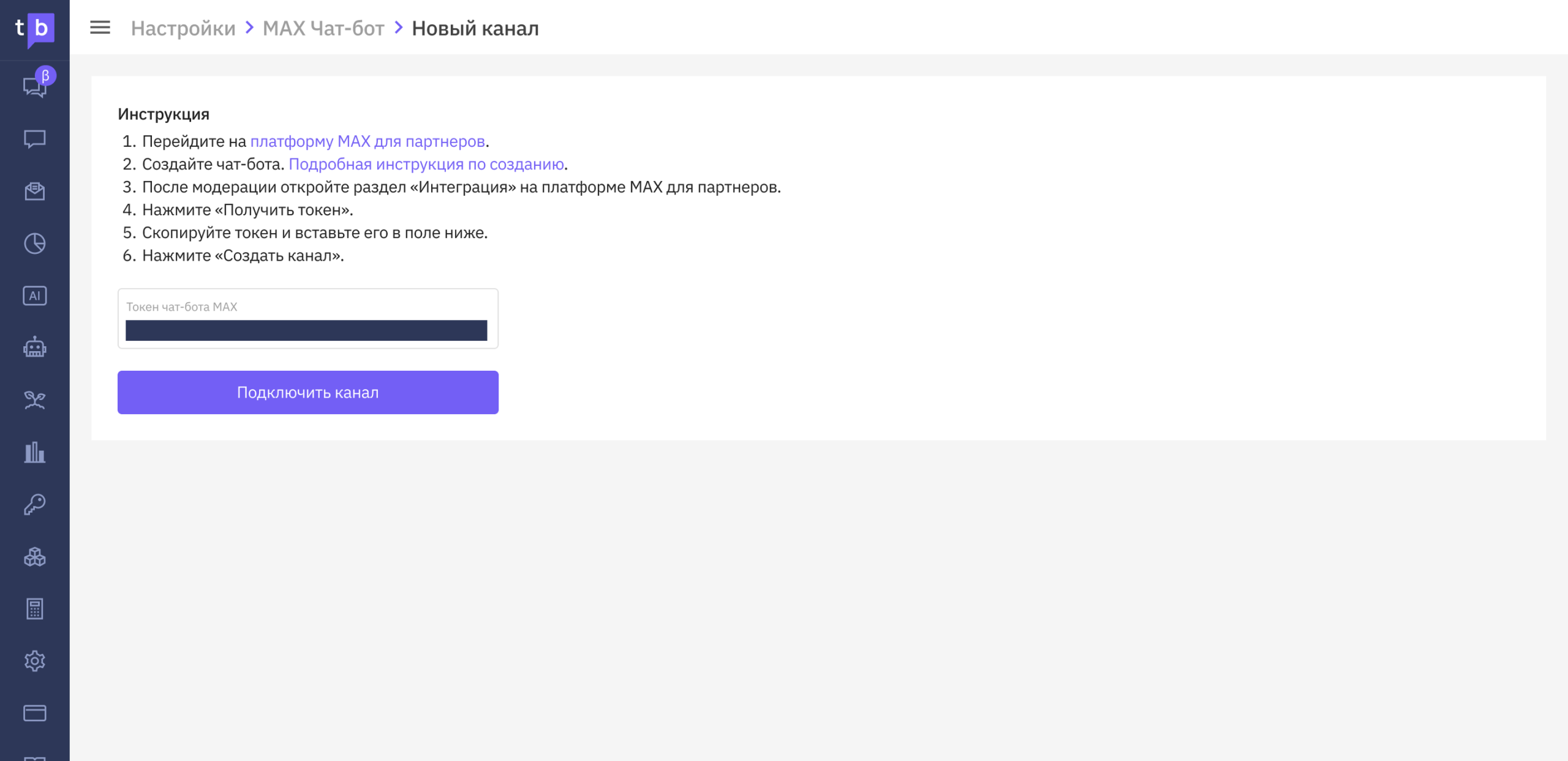 Чтобы подключить чат-бота MAX, нужно передать токен бота в TextBack. Для этого: