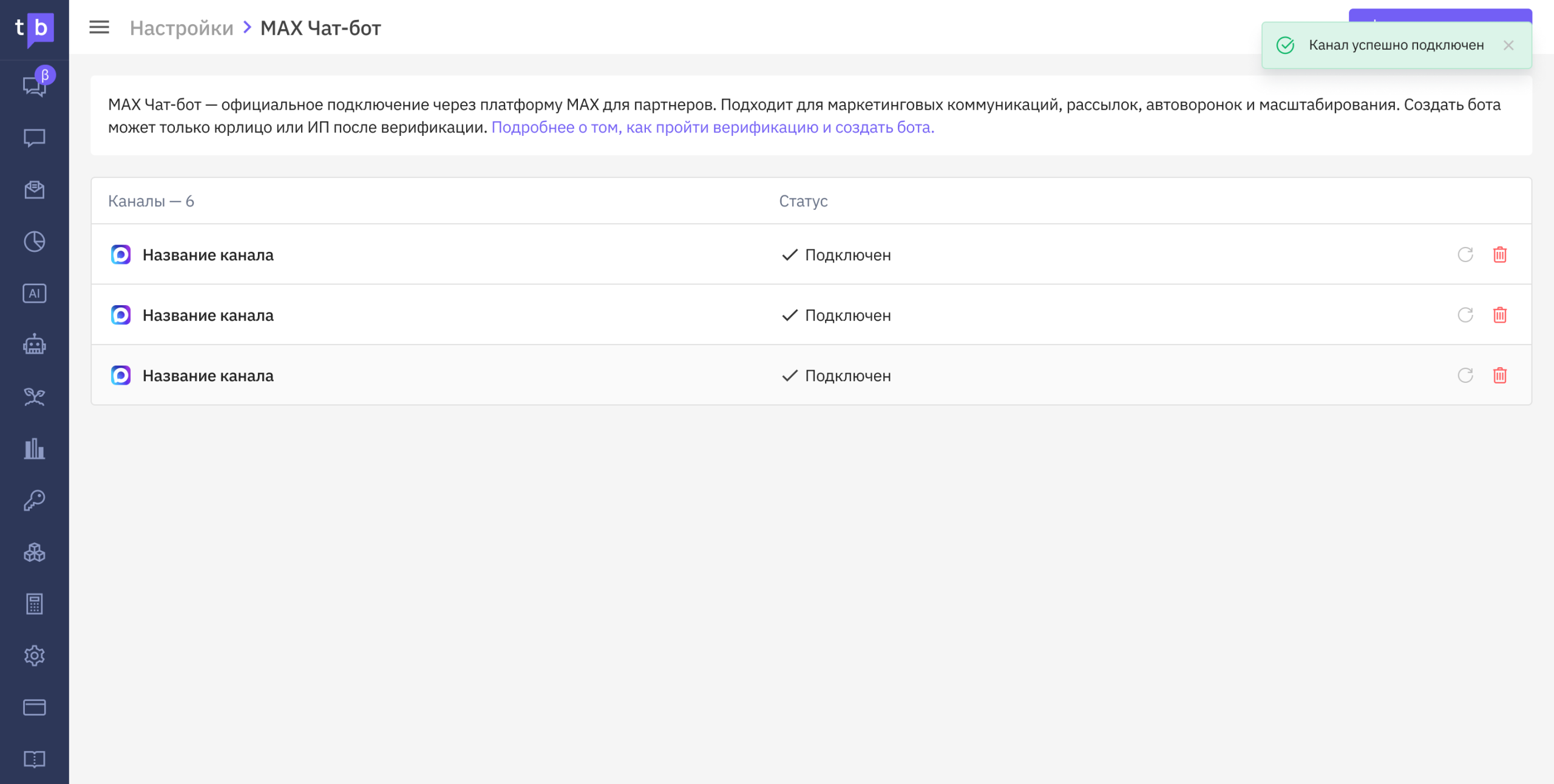Если все прошло успешно, канал появится в списке с пушем «Канал успешно подключен».