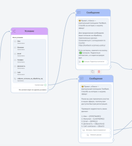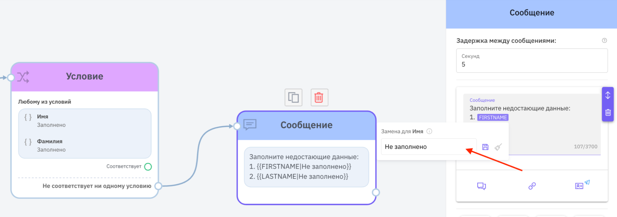 А еще теперь вы можете объединить несколько условий в одном блоке. Если вам нужно проверить, заполнены ли три поля (email, телефон, должность), вы можете объединить эти условия в один блок. Если одно из полей не заполнено, бот предложит заполнить только недостающую информацию.