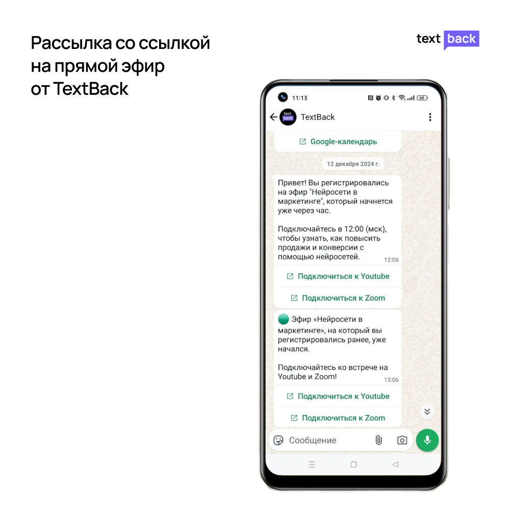 Используйте автоматические напоминания через WhatsApp. Цепочка сообщений прогревает участников и держит их внимание до старта онлайн-вебинара. Например: