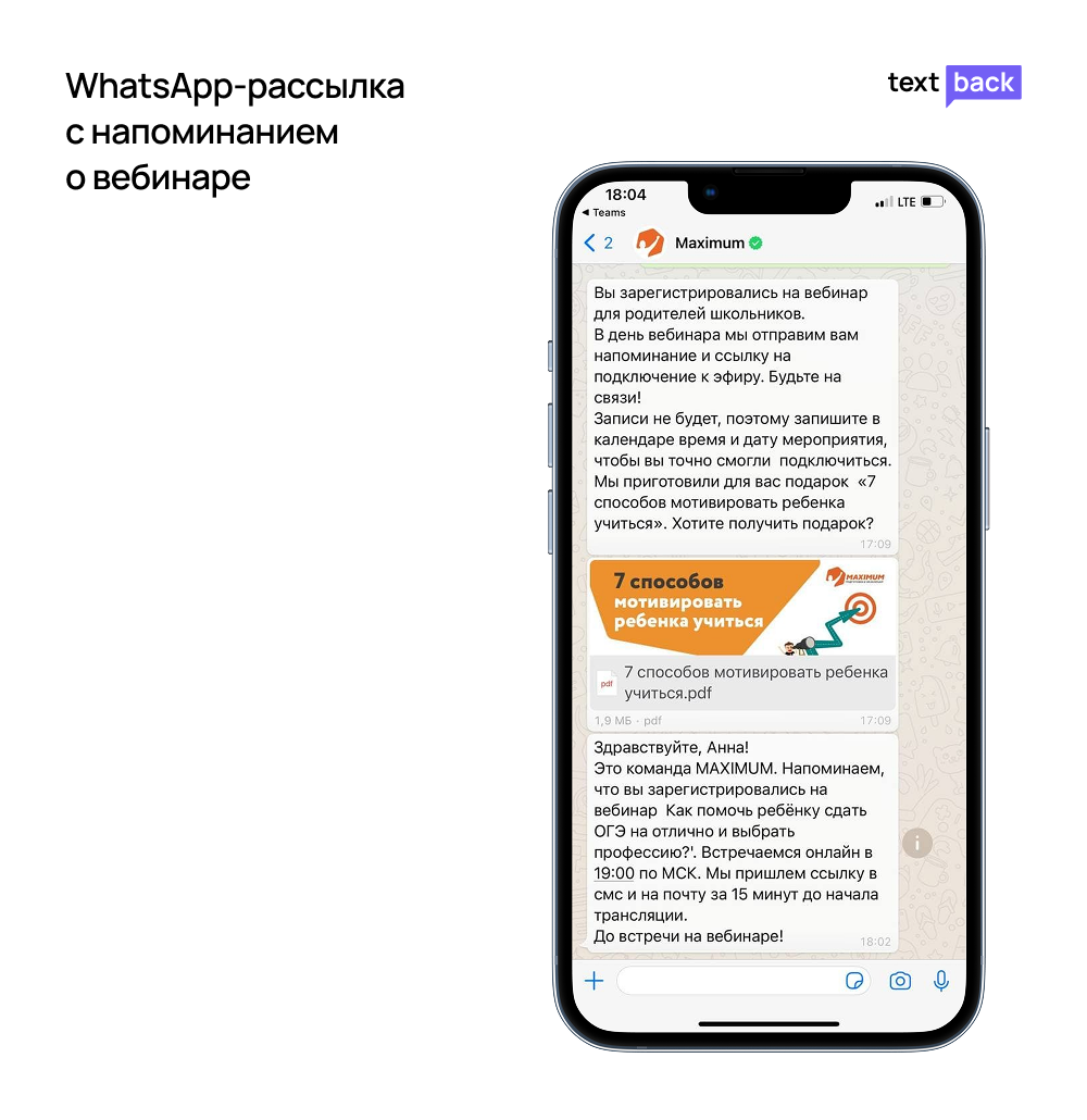 Российская образовательная компания MAXIMUM EDUCATION внедрила цепочку WhatsApp-напоминаний через TextBack. Раньше на их онлайн-вебинары приходило около 19% зарегистрировавшихся участников, после — доходимость выросла на 10%.