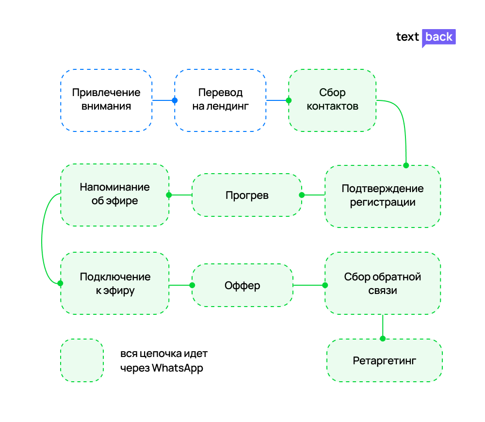 Чтобы участники приходили и оставались вовлеченными, важно закрыть все четыре «узких места»: напоминания, демонстрацию ценности, персонализацию и продуманный путь клиента. В этом помогает автоматизация WhatsApp-цепочек через TextBack с интеграцией GetCourse: