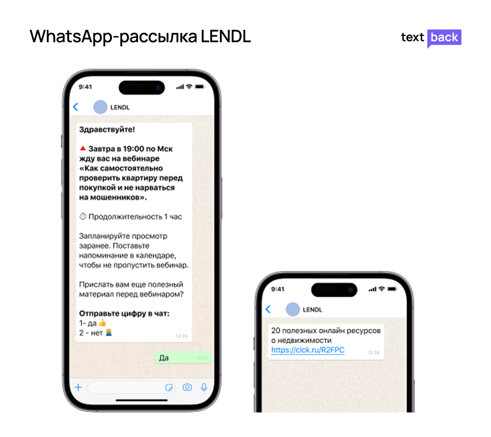 В агентство недвижимости LENDL столкнулись с низкой доходимостью на вебинары. Для решения проблемы настроили автоматизированные WhatsApp-цепочки с регистрацией и напоминаниями о вебинарах, сегментацию участников, интеграцию с CRM. В результате стоимость лида сократилась в 2 раза, доходимость до вебинара выросла до 74%. А еще собрана база с валидными контактами для общения после эфира.