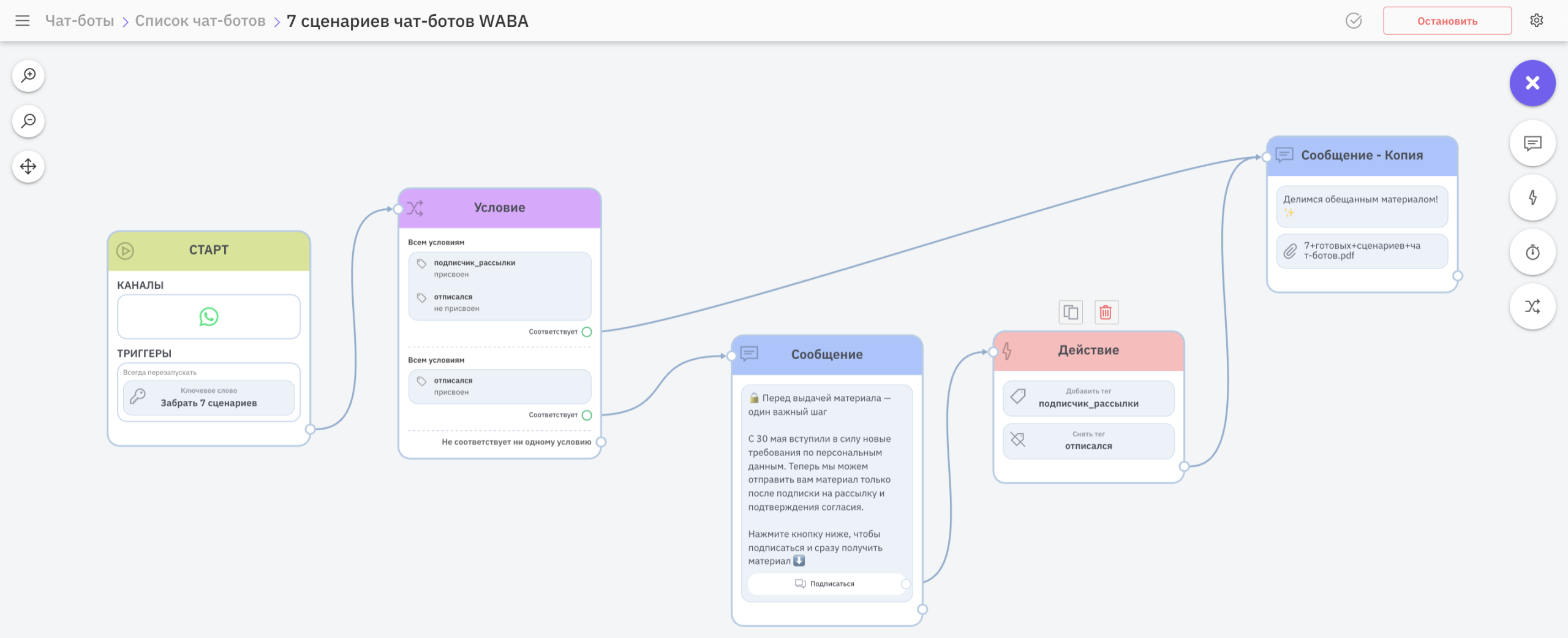 - Удобный визуальный редактор. Вы можете собирать цепочки сообщений как конструктор, перетаскивая блоки и соединяя их.