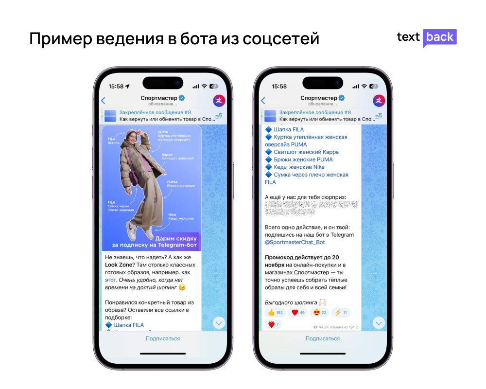 Такой подход позволяет решить две задачи: собрать аудиторию в чат-бот и подписать её на канал.